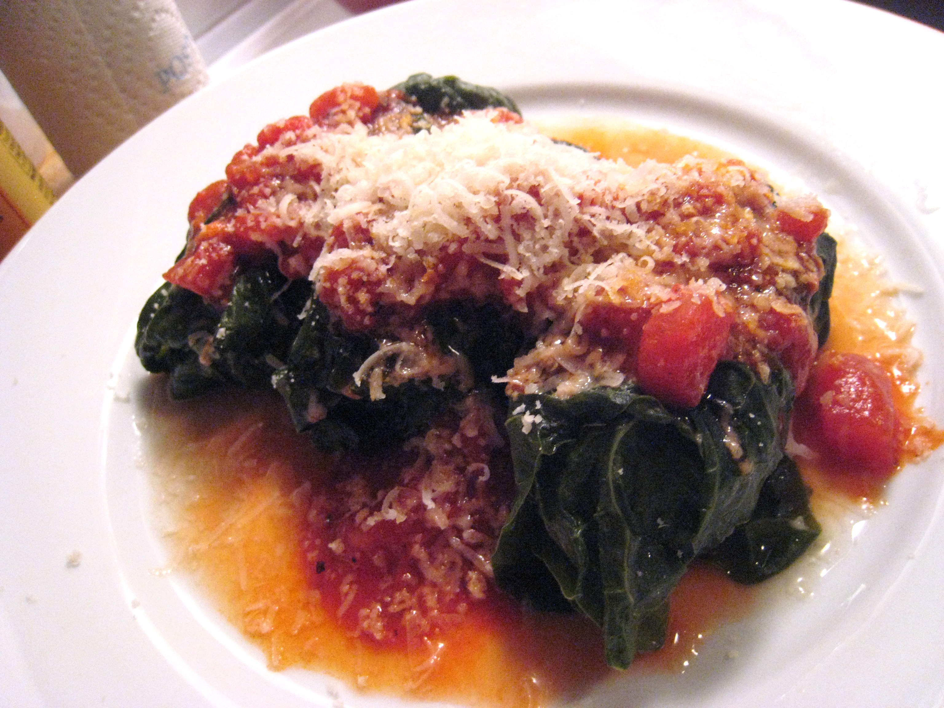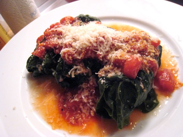 4. To serve, remove the chard rolls from its broth bath with tongs. You can discard the broth afterwards. Top the rolls with sauce and Parmesan cheese, if desired — and why wouldn’t you?