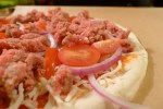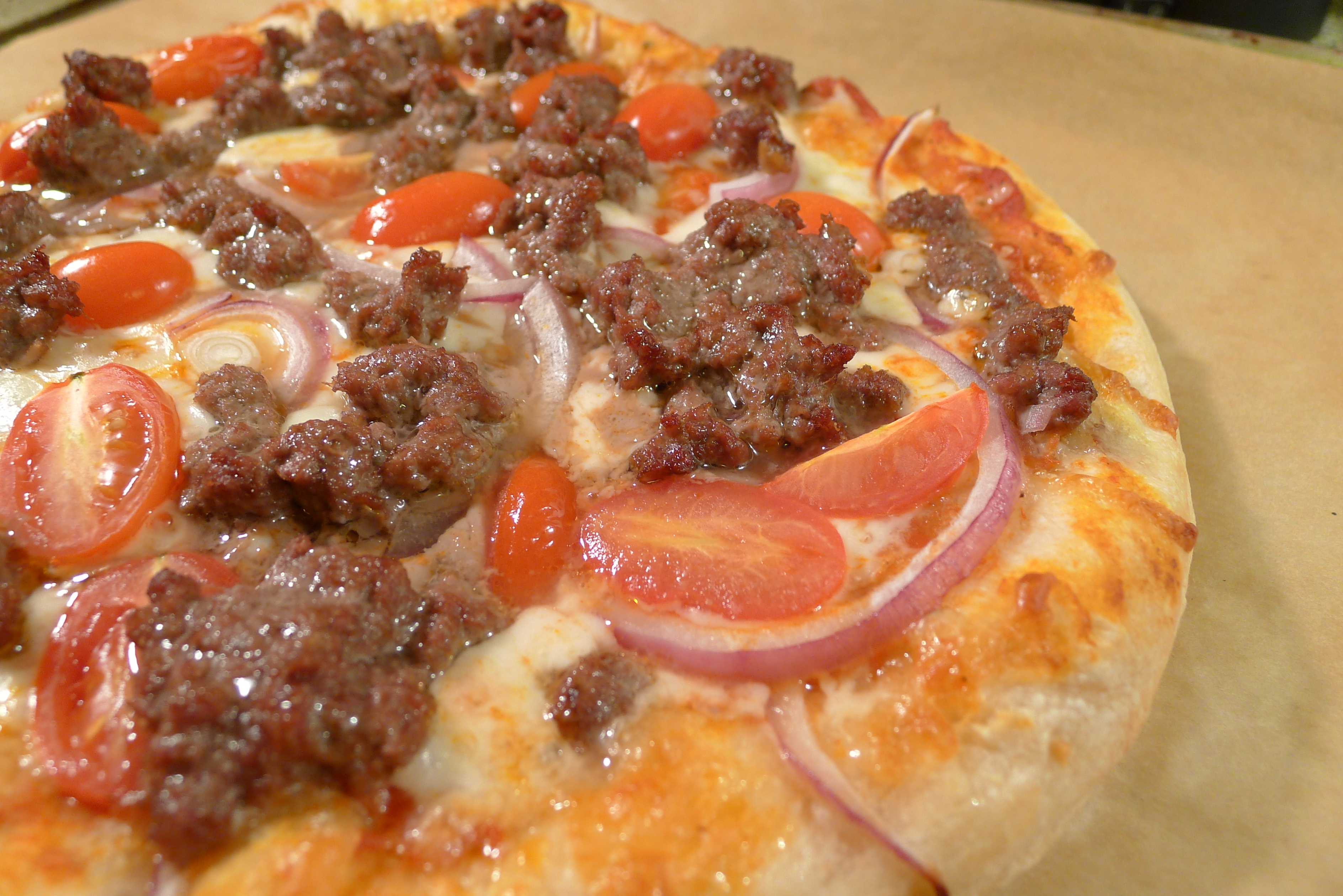 5. Scatter the onion rings, halved tomatoes, and RAW ground beef over the pizza.