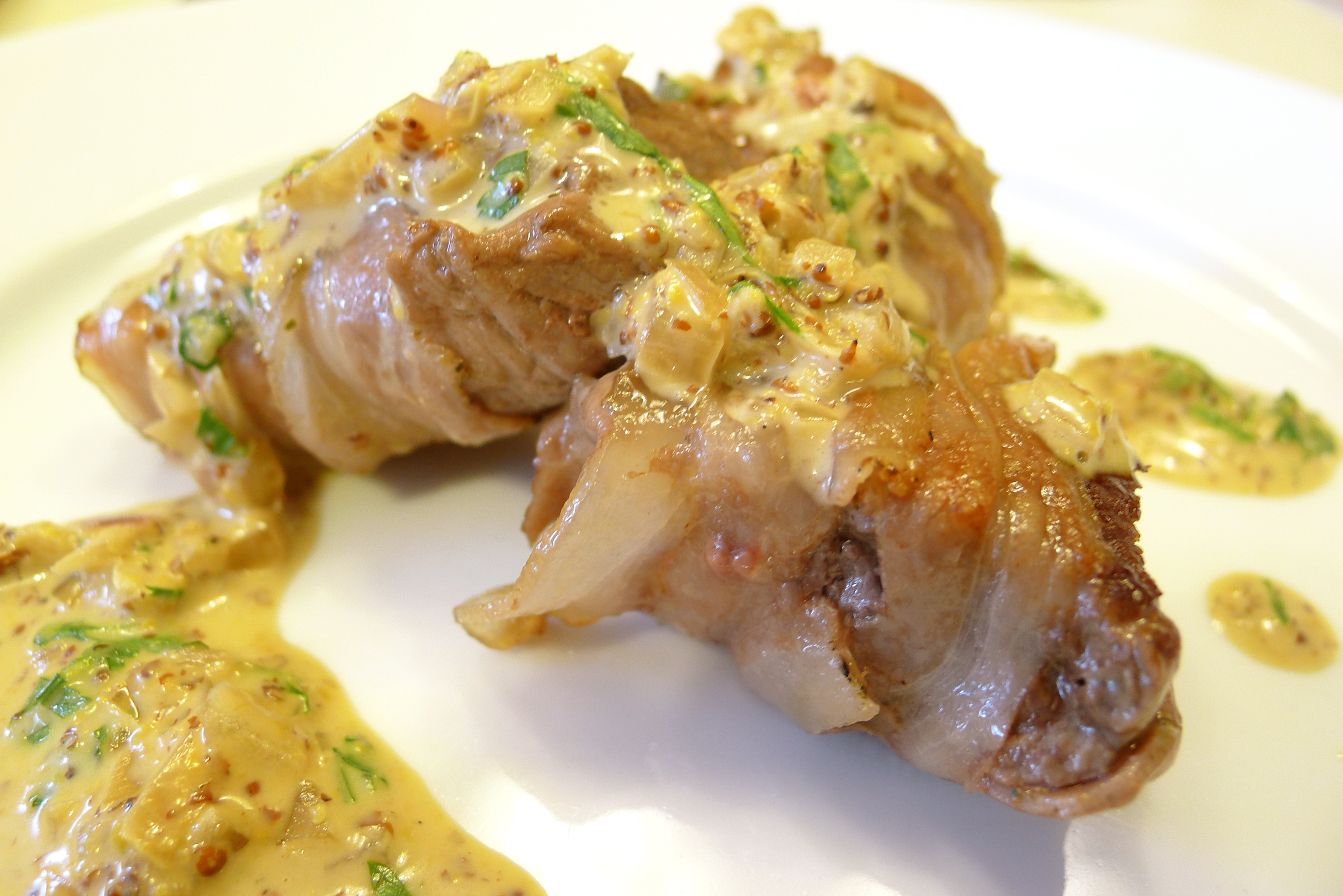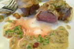 3. Reduce the heat to medium, and add the shallots to the same skillet. Sauté the shallots until they begin to get translucent, scraping up the browned bits from the bottom of the pan as you go. Carefully add the bourbon and the water to the pan. Dissolve the browned bits in the added liquid. Once most of the alcohol has cooked away, add the mustard and the heavy cream. Stir everything together. Continue to simmer the sauce until it has thickened. Turn off the heat, and add the parsley to the sauce.
