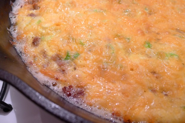 7. When the potato cake is starting to brown on the bottom, and the potato shreds are beginning to turn a little translucent, add the egg mixture to the pan. Scatter the shredded cheese on top of the eggs. Let the eggs set up for about a minute or two before putting the skillet in the oven. Bake it for about 15-20 minutes, until the top is golden and puffed. Let cool for about 10-15 minutes before slicing into wedges and serving.