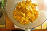 1. Remove the corn kernels from the cob. To do this with minimal mess, stand each ear of corn in a large shallow dish and slice down the length of each ear with a sharp knife. Keep the knife as close to the cob as possible. Rotate the ear and continue to slice down each exposed side until all the kernels are removed.