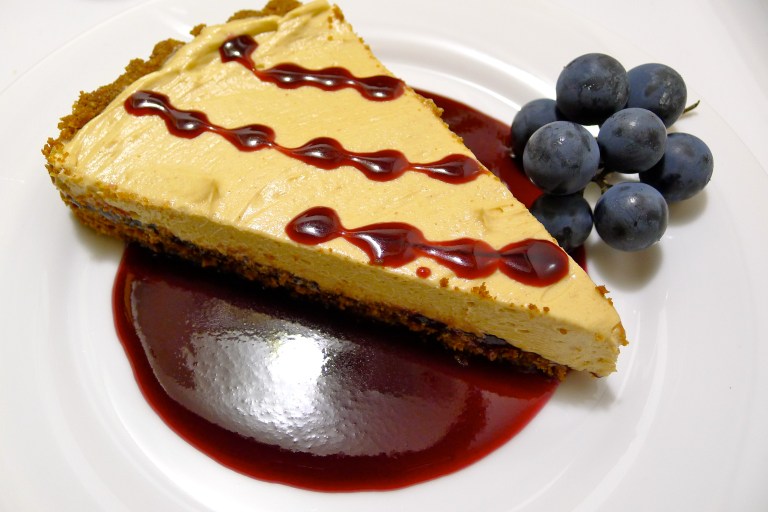 11. When the tart has cooled and set, cut it into wedges. Make a pool of grape sauce in the middle of a dessert plate, and place one tart piece on top of the purple puddle. Serve immediately.