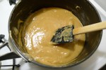 8. Bring the pulp and 1/2 cup of water to a boil in a small saucepan. When the peeled grapes have turned opaque, pour them into a mesh sieve set over a medium-sized bowl. Using a spatula, push the pulp through the sieve. Discard the seeds.