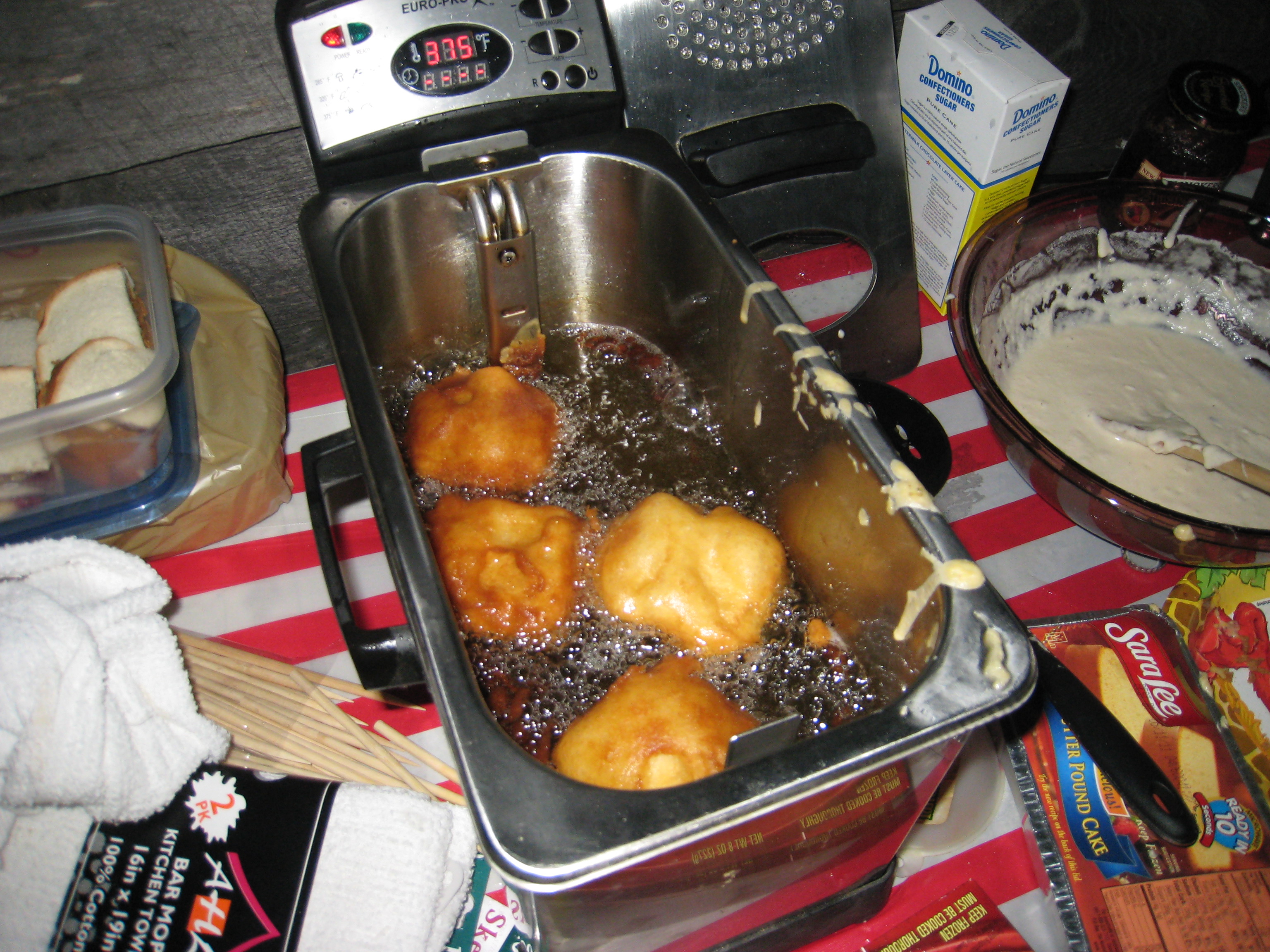 As I must be the world’s worst egg peeler, I let the eggs boil until the yolks were firmer — about 5 minutes. Next time, I’ll let them be a little runnier as I found out that a layer of sausage hides a multitude of fingernail gouges and fingertip-sized divots. The most important thing is that the oil remains hot — between 350-375° F — and the layer of sausage must remain reasonably thin.