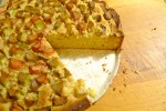 6. Spread the batter out as evenly as possible onto the bottom of the springform pan. It will be thick. Arrange the rhubarb by pressing each piece into the batter in concentric circles. Bake the cake for about 1 hour and 30 minutes, until the top is golden and the center has set.