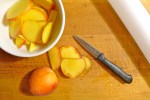 2. Defuzz the peaches by very gently rubbing as much of the peach fuzz off as you can under cold running water. Cut the peaches into slices that are a little more than a quarter-inch thick.