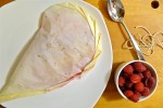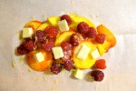3. Evenly divide the peach slices between 4 parchment paper sheets. You will use about one peach’s worth of slices per packet. Tuck one split vanilla bean pod in-between the peach slices. The vanilla should perfume the fruit, but not overwhelm it. Arrange a small handful of raspberries over the peaches. Sprinkle the fruit with cane sugar. Grate a little lemon zest over the top. Dot the fruit with about a 1/2 tablespoon of cold butter cut into small pieces