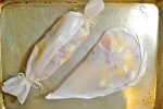 Alternatively, you can arrange your food in the center of a square of parchment paper, pull two of the sides up, fold them down, and then tie off the ends with cooking string. For some more examples of parchment paper packets, I direct you to this month’s Daring Cooks’ Challenge PDF.