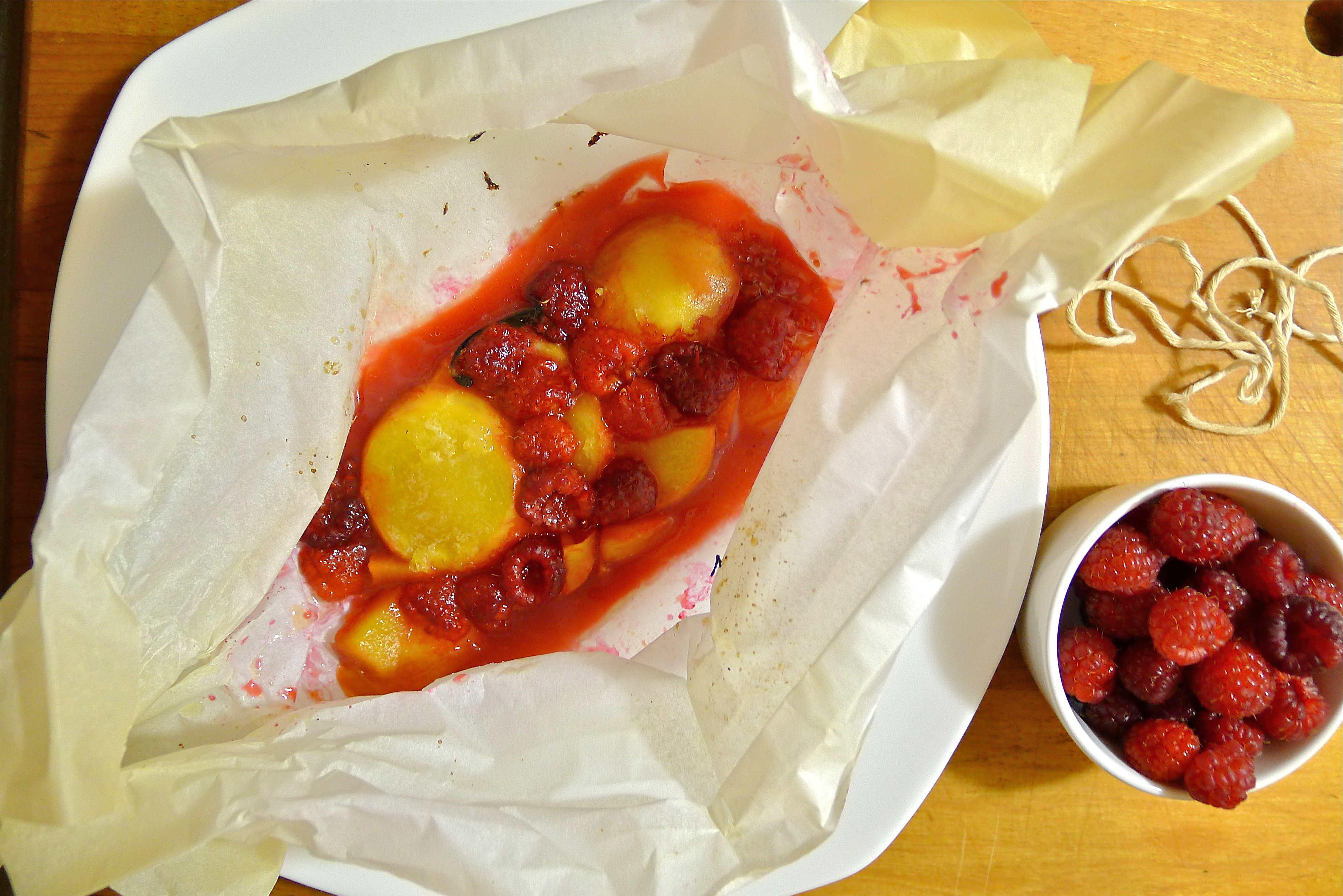 You can serve the peaches and raspberries straight from the paper, or you can transfer the fruit to a small bowl to top with a scoop of vanilla ice cream or gelato.