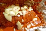5. Cut a piece of parchment paper to lay on top of the confit. Press it down gently to adhere. Roast the confit until the vegetables have cooked through (the eggplant will take the longest). This should take between 45 minutes to an hour. It might even take over an hour. In all honesty, I can’t really remember since I was a couple of beers in by then. Just start checking it around the 45 minute mark!