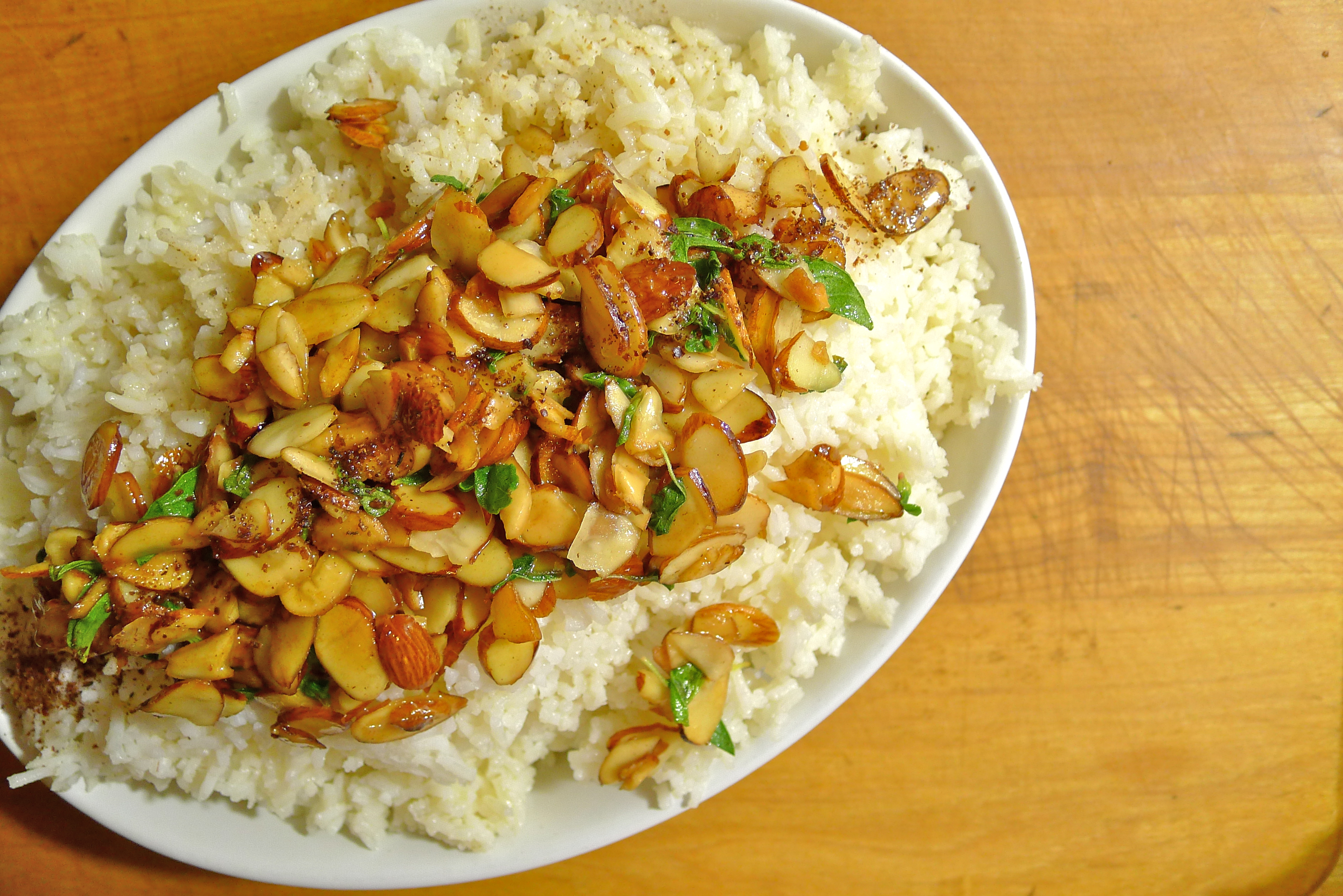 4. Mound the Parmesan rice in a large dish. Spoon out the almonds and pour the sauce evenly over the rice. Sprinkle with sumac and serve with roast chicken.