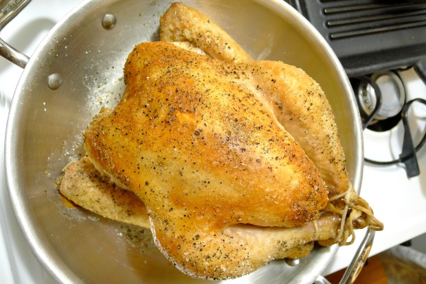 I did once try Keller’s approach sans butter and found the skin to still be tasty, but less glossy and appealing overall. I do like his salting technique though: “I like to rain the salt over the bird so that it has a nice uniform coating that will result in a crisp, salty, flavorful skin (about 1 tablespoon). When it’s cooked, you should still be able to make out the salt baked onto the crisp skin. Season to taste with pepper.”
