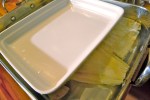 • Take a large roasting pan and arrange the corn husks in it. Cover them with hot water until they are completely submerged. Weight them down with a heavy plate or dish for about 4 hours, or even overnight.