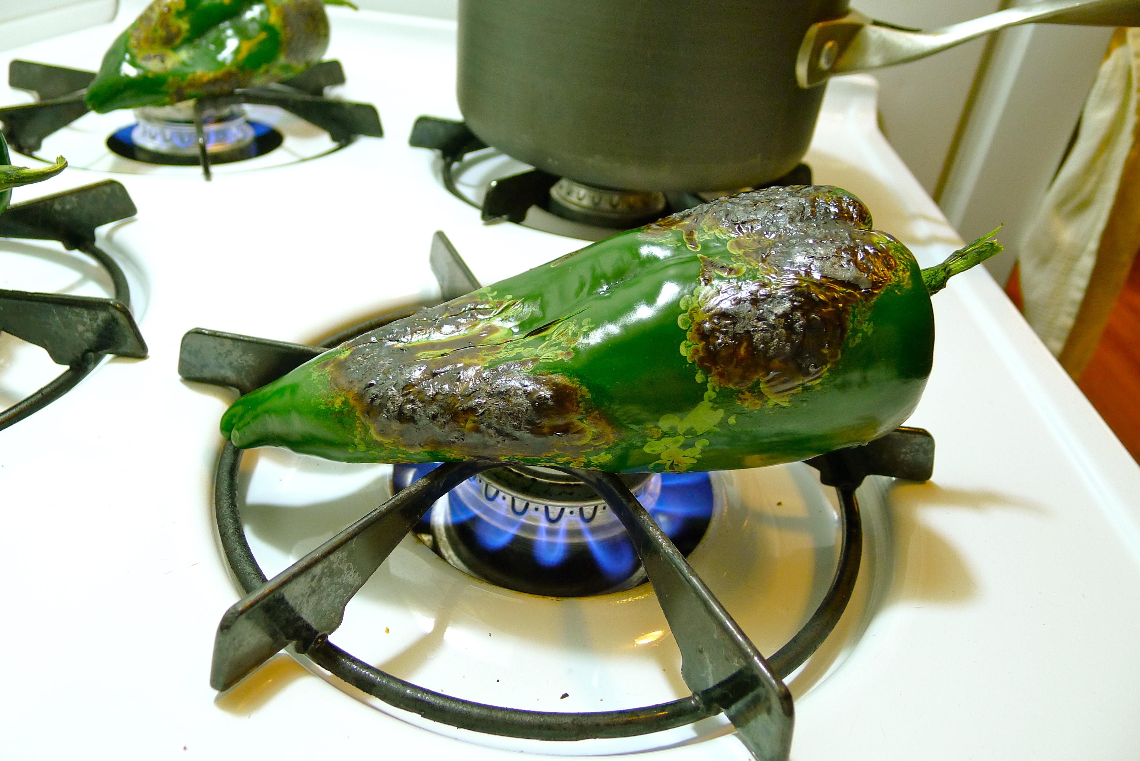 • If you have a gas range, set the poblano peppers directly onto the gas burners with the heat on high. Turn the peppers periodically to make sure that their skins char evenly. Poblano peppers have relatively thin skins compared to bell peppers, so watch them carefully as they will char quickly.