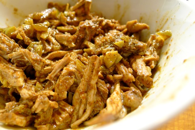 • In a medium sauce pan, whisk the chili powder and the salt if needed with about 3 cups of water. Add the pork shoulder to the pan and bring the liquid up to a boil. When the liquid is boiling, reduce the heat to medium-low and simmer the pork, partially covered, for about an hour. The meat should be falling-apart tender. Let the meat cool slightly in the broth before removing it to a plate. Do not get rid of the cooking liquid.