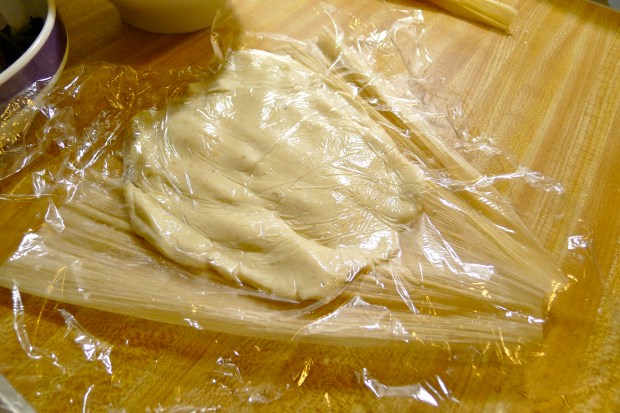 • Lay a corn husk out so that it fans away from you. Drop a dollop of about 1/4 cup of tamal dough in the middle of the upper center of the husk. Lay a piece of plastic wrap over the top of it, and use your hands to smooth the dough out in a thin layer. Make sure the dough goes all the way to the top edge, but be sure to leave a “border” of corn husk on either side. The spread-out dough should be roughly in a 4-inch square shape.