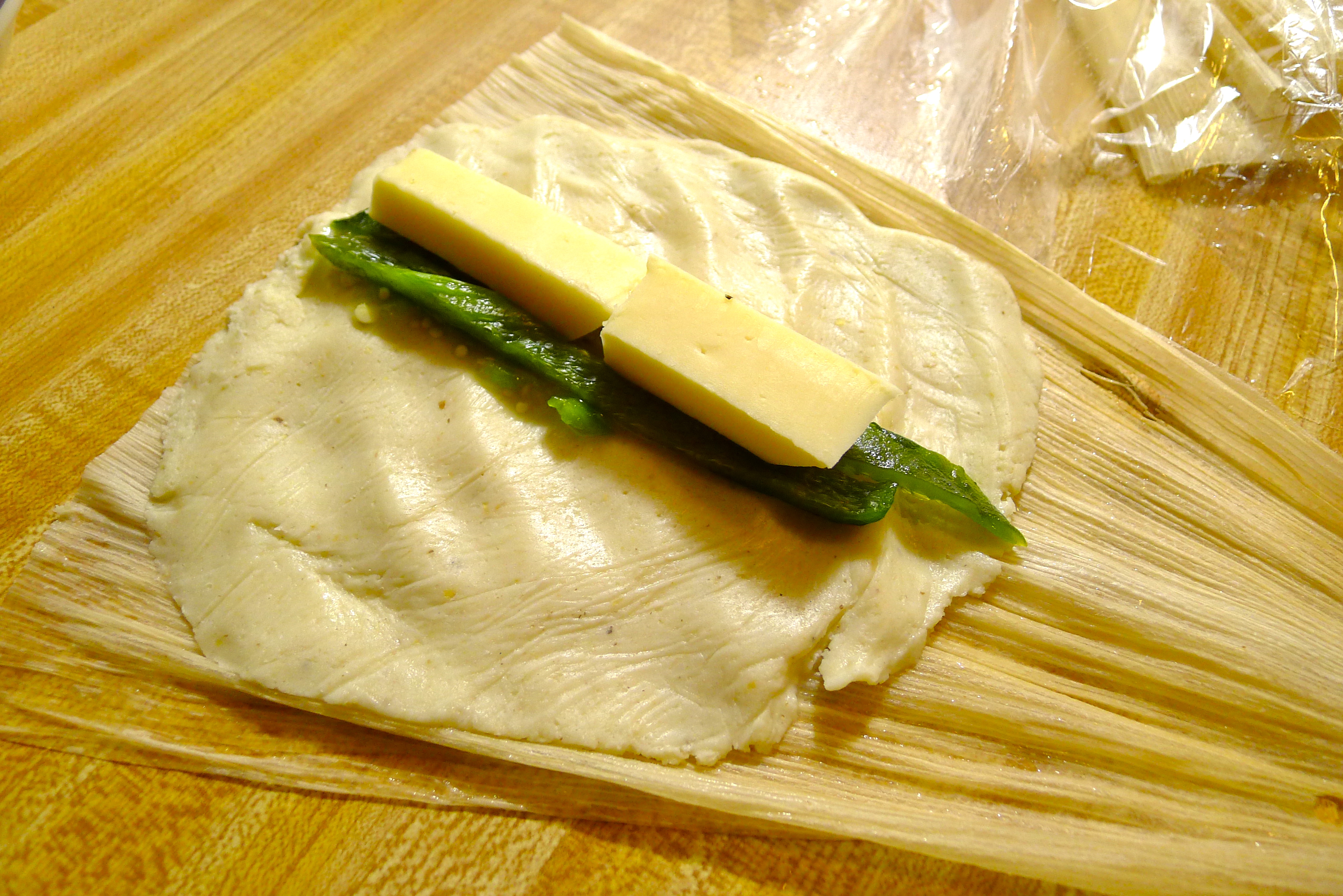 • Once the dough is smoothed out in a thin layer that extends all the way to the edge of the top of the husk, it is time to fill the tamal. For the pork tamales, mound a good spoonful of filling along the center of the dough. For the chili and cheese tamales, Put about a teaspoon of salsa verde down the center of the dough. Lay 3 poblano chili strips down on top of the salsa, followed by a piece (or two) of cheese.